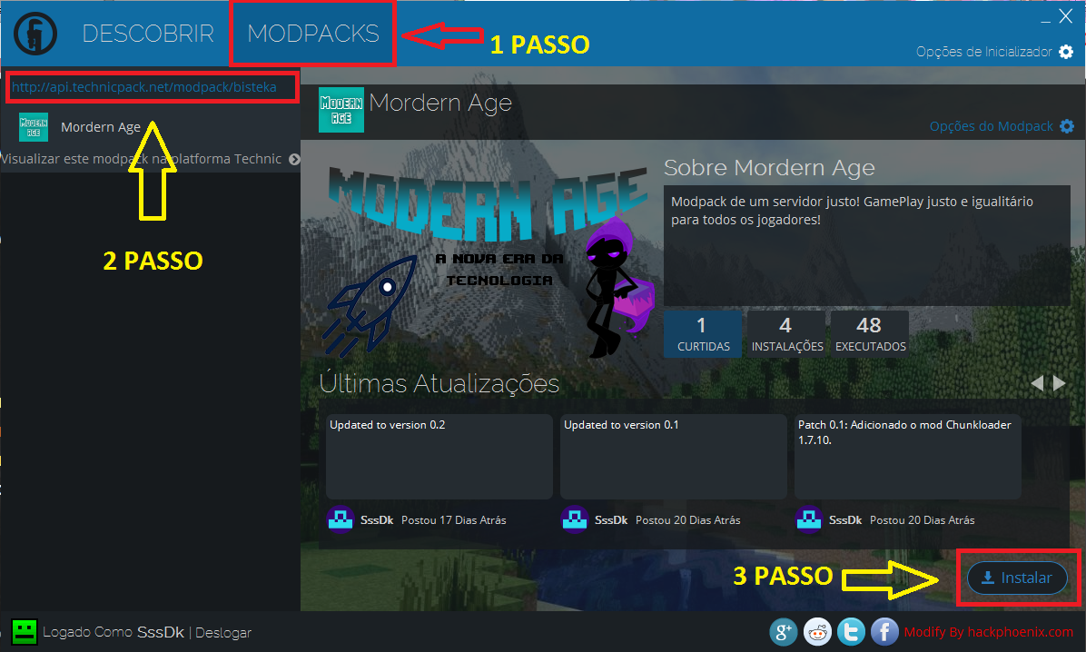 3º Passo: Abra o Technic Launcher e clique na aba MODPACKS e em seguida, "Add pack or Search" cole o seguinte link: